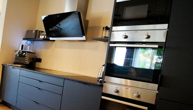 Die in den modernen und zeitlosen Essensbereich integrierte Designerküche bietet neben einem Tresen auch ein modernes Kühlpult, wodurch immer gekühlte Getränke zum Greifen nah sind und nicht separat im Kühlschrank gelagert werden müssen. Die moderne Technik bietet neben einem großen Kochfeld und Backofen auch eine Mikrowelle, sowie eine Gastronomiespülmaschine für schnelles Reinigen des Geschirrs.